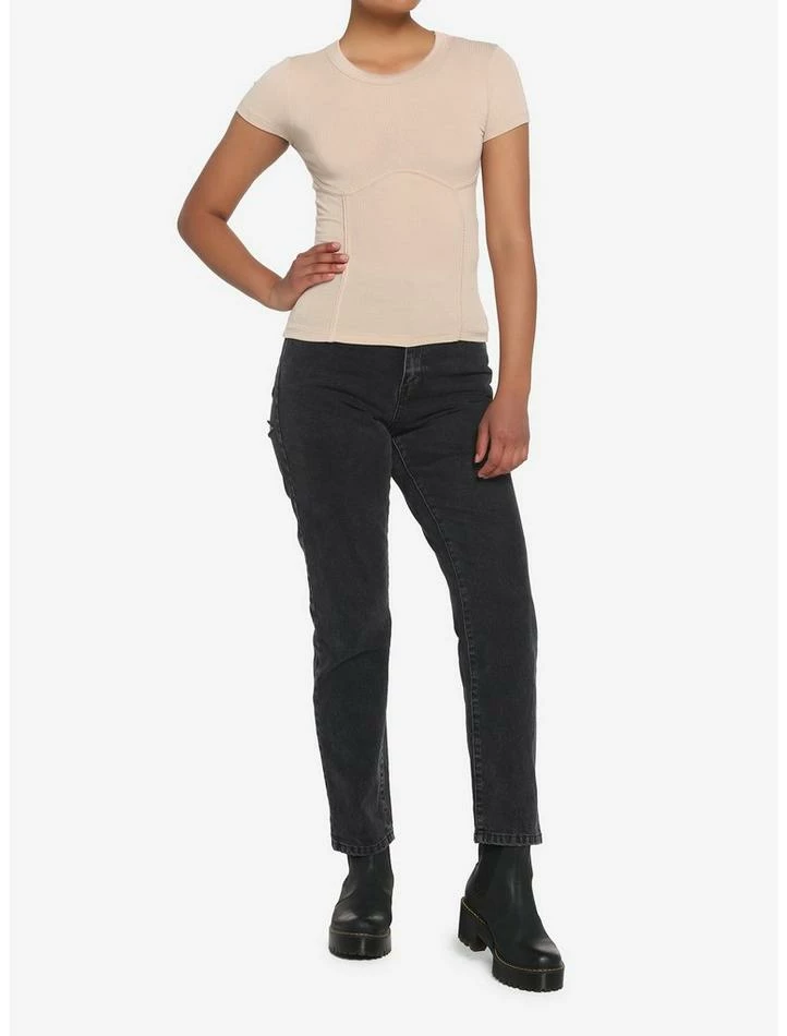Add more basics into your rotation with this almond tee featuring underbust seam detailing.ย