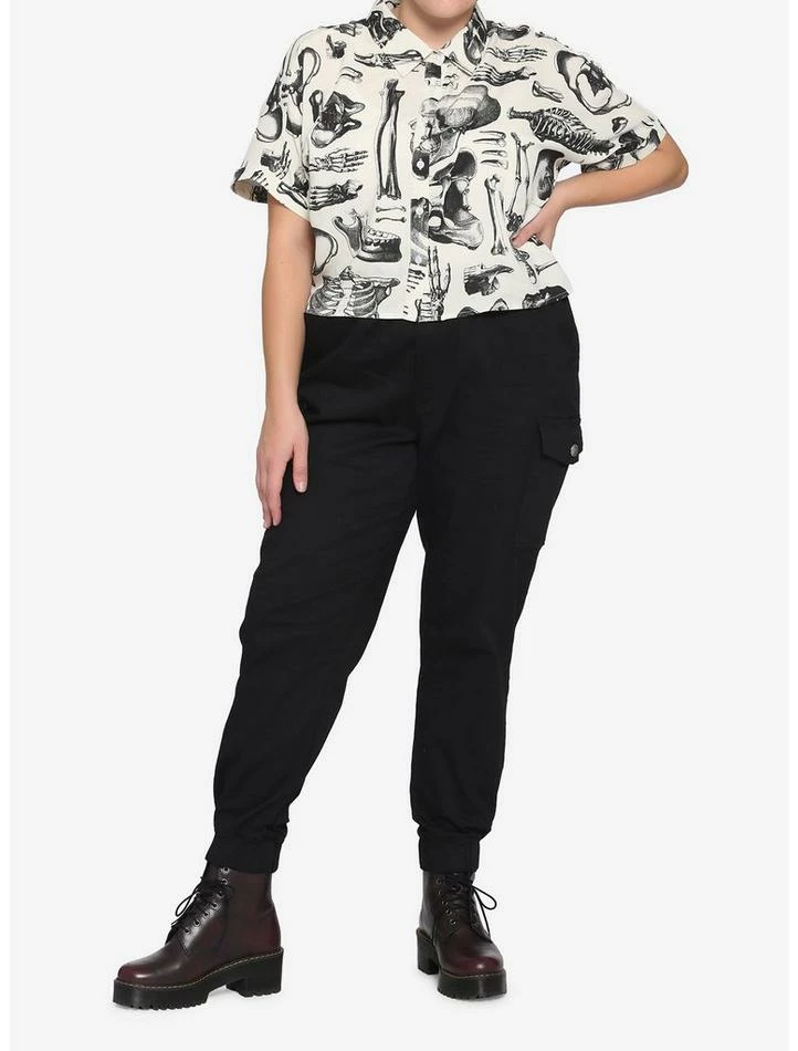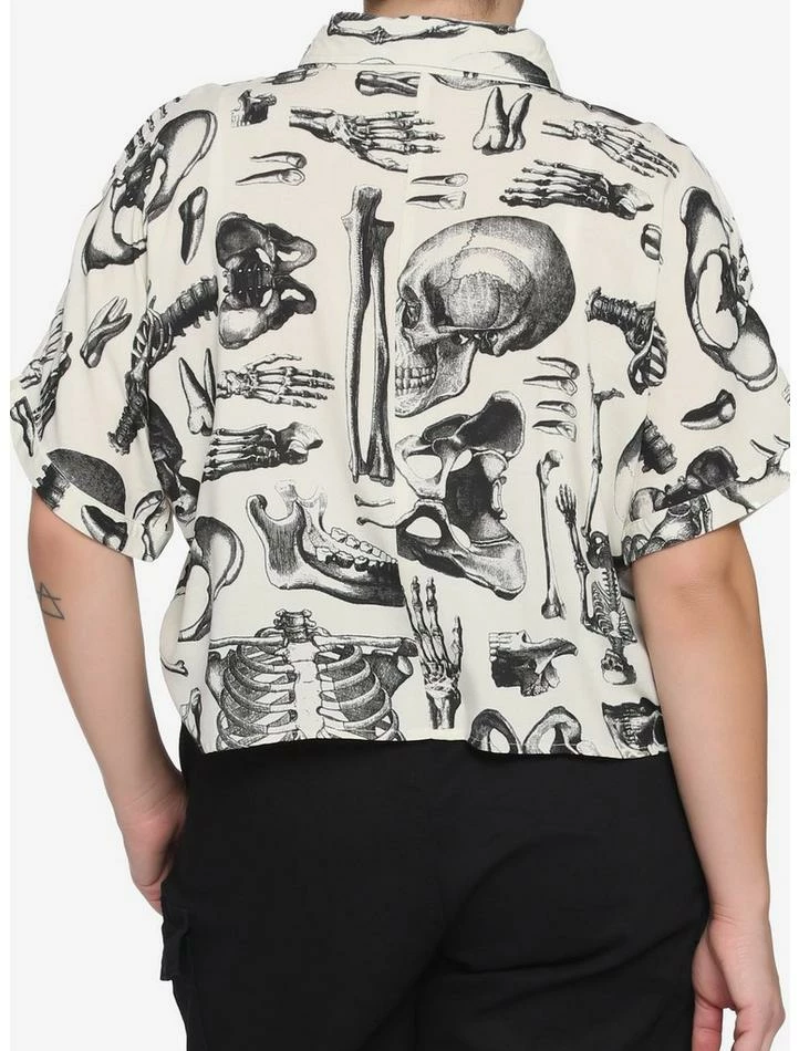 ย If your wardrobe is looking a little bare bones, add this boxy button-up! Sepia-toned, collared button-up crop top features an allover print of anatomical skeleton images.