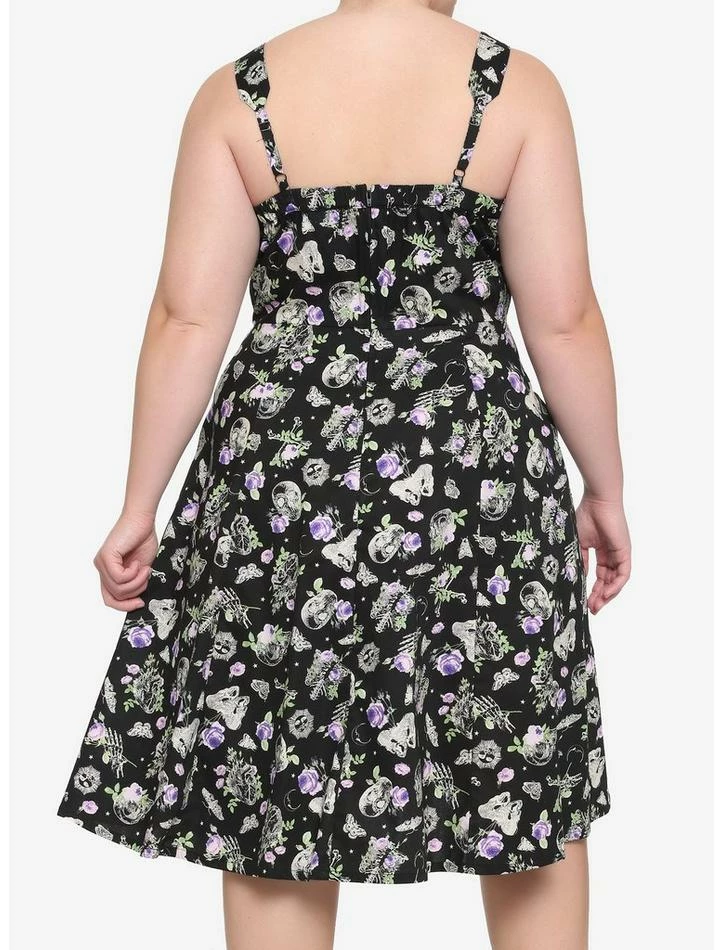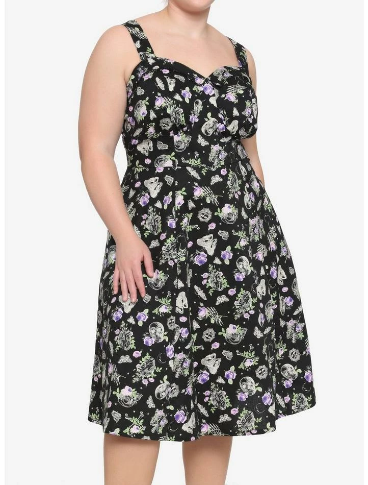 This retro-style dress features an X-ray anatomy floral print, sweetheart neckline, elastic back detail to provide some stretch, pockets, adjustable straps and back zipper closure.
