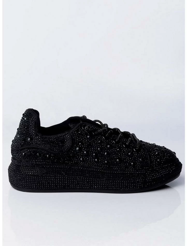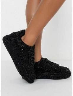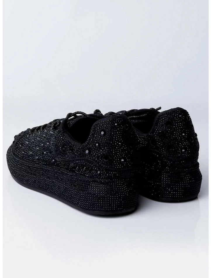 The Azalea Wang Diamonds on Me Dancing Sneaker features a cushy nylon base, rhinestone-embellished upper, lace up vamp, rhinestone-embellished laces, and equally embellished flatform sole. Complete with a rounded toe and low cut collar.