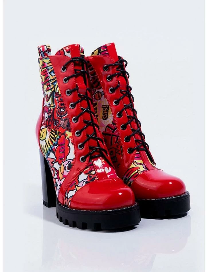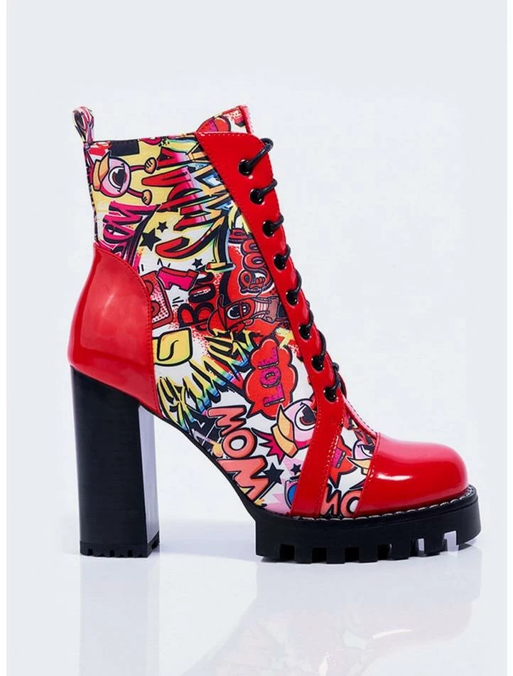 Be the hero of your own comic book! With comic inspired graphics, these booties feature patent toe, heel, and lace trim, with a side zipper closure. 5″ shaft height, 4″ heel height.