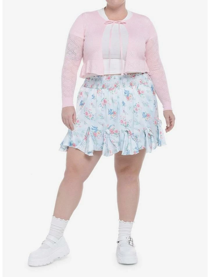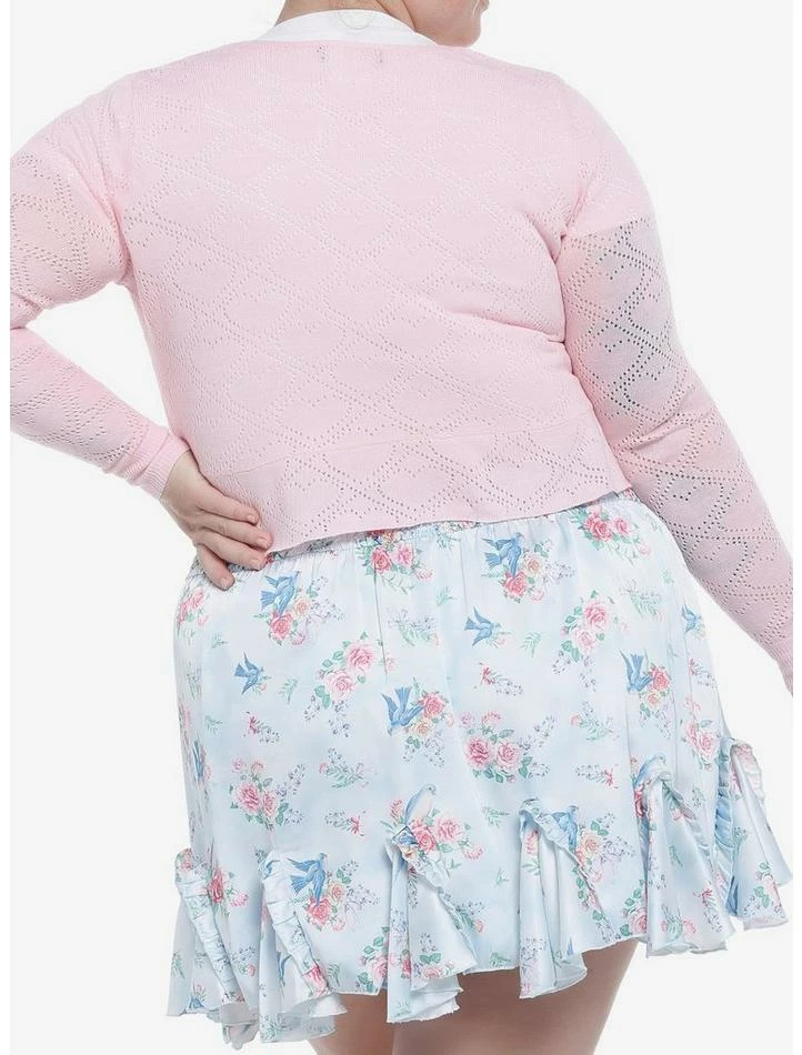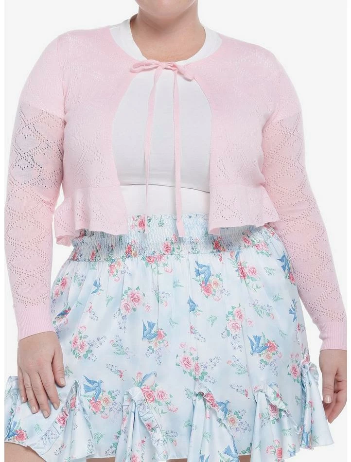 Looking for an extra layer that is oh-so-sweet? This tie-front cardi has hearts knit into its baby pink fabric, as well as a slight ruffle at the bottom hem.