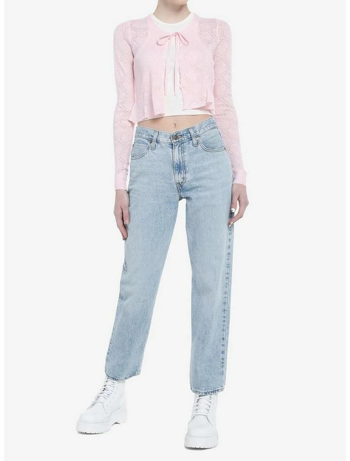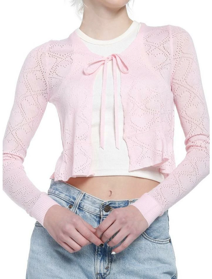 Looking for an extra layer that is oh-so-sweet? This tie-front cardi has hearts knit into its baby pink fabric, as well as a slight ruffle at the bottom hem.