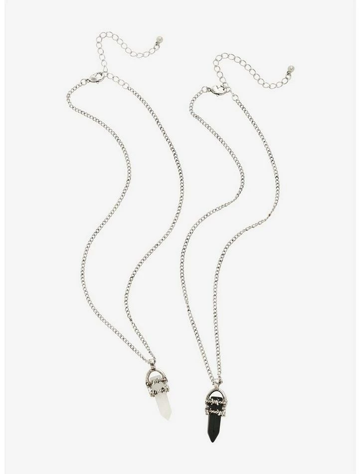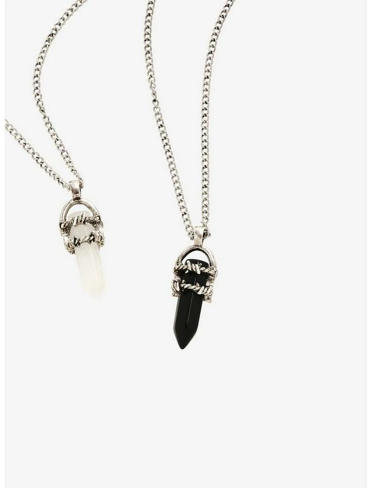 You and your best friend are gems! This necklace set includes a clear white and a solid black synthetic crystal with barbed wire accents. One for you and one for them!