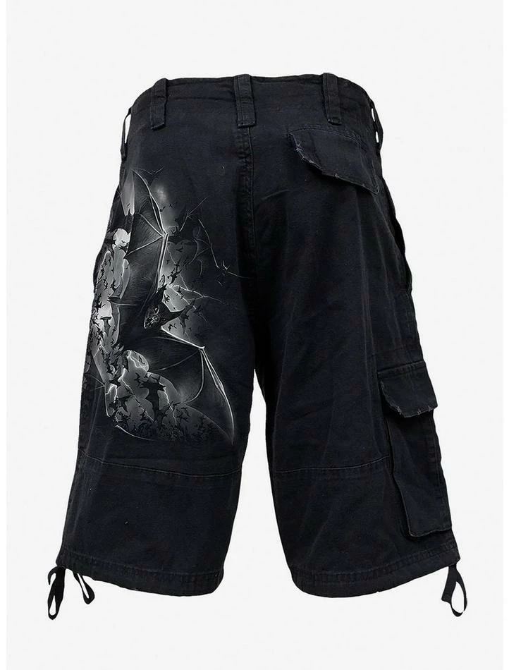 Asymmetric front-only print of a highly detailed sombre skull with fused mouth, set in front of a silhouetted shape of swirling bats and splattered liquid. Bridging the gap between gothic and mainstream, this design crosses all boundaries. These vintage cargo shorts are made of stone washed cotton denim.