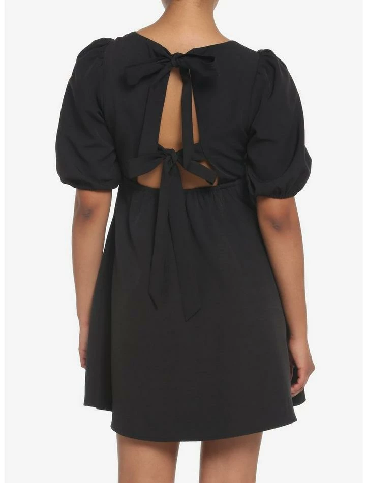 Add some more flare to your LBD! This fun and flirty black babydoll dress features puffed sleeves and double tie straps on the back, with an elasticated waist and princess seams on the chest.ย