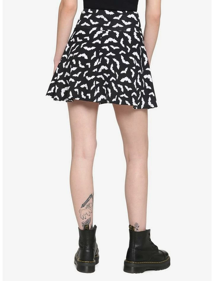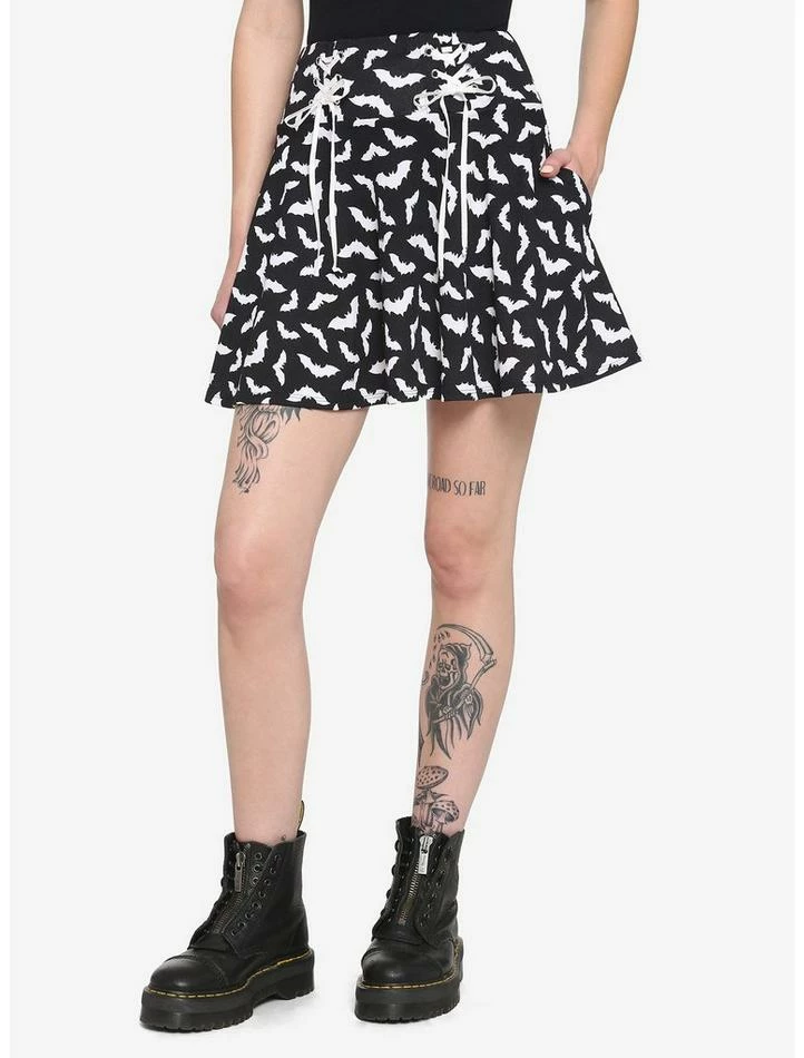 Need something to wear for a night out with your batties? How about this skater skirt? It features an allover print of white bats, with white double lace-up detailing at the hip. Complete with side seam pockets and an elasticated waistband.
