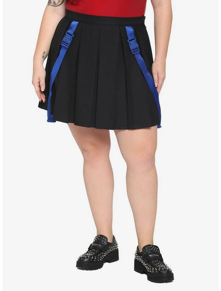 Level up your skirt game with this black skirt featuring blue straps with buckles, side zipper closure and pleats.Β