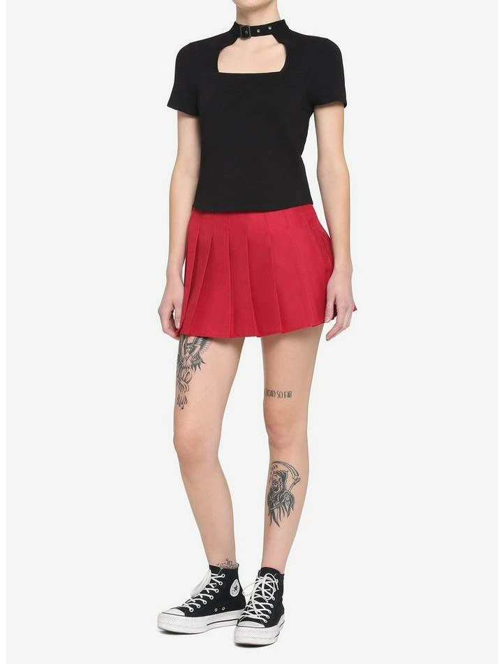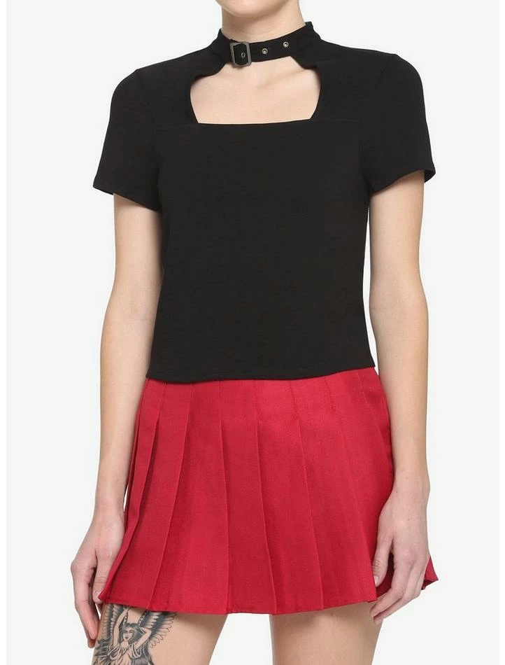 Add some hardware to your look with this black cropped shirt. Featuring a cutout opening on the chest and an adjustable buckle and grommet choker.