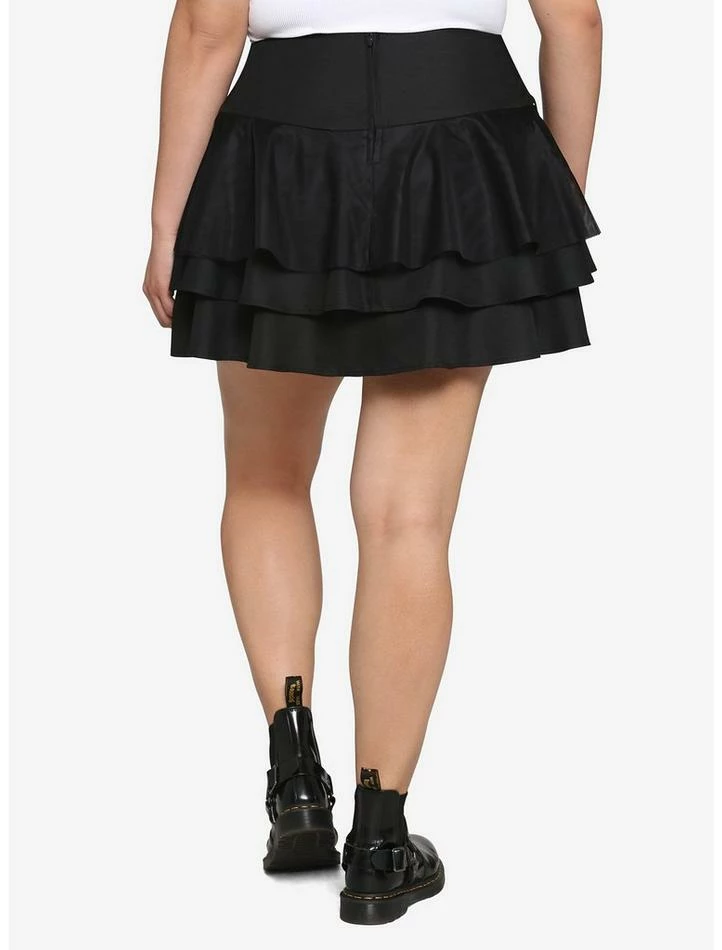 It’s all about hardware! Channel those goth girl summer vibes in this black skirt! It has a tiered silhouette and features grommet and buckle detailing on the front and lace-up detailing on the sides. Complete with a back zipper closure.