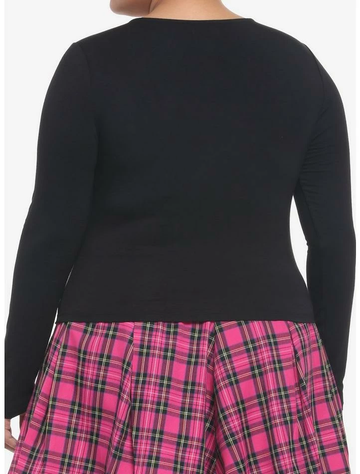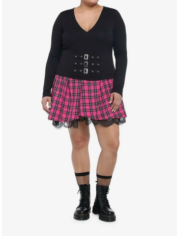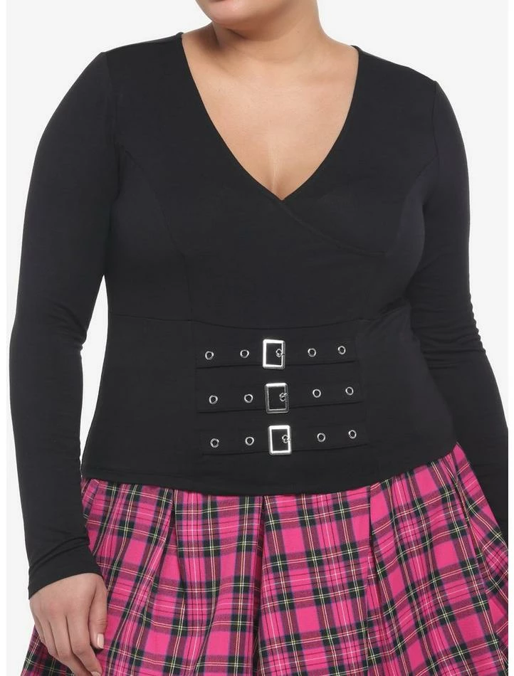 Need a layering piece with a bit of edge? This long-sleeve top has a V-neck and a slightly cropped fit but also faux buckles on the front.