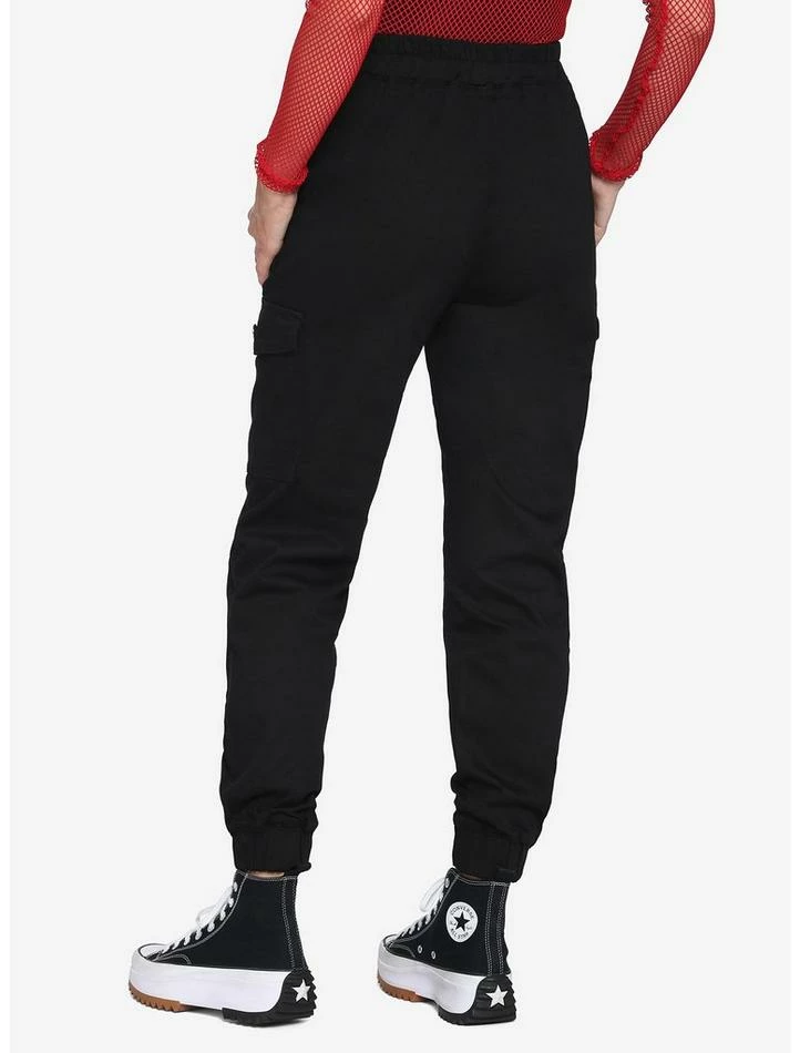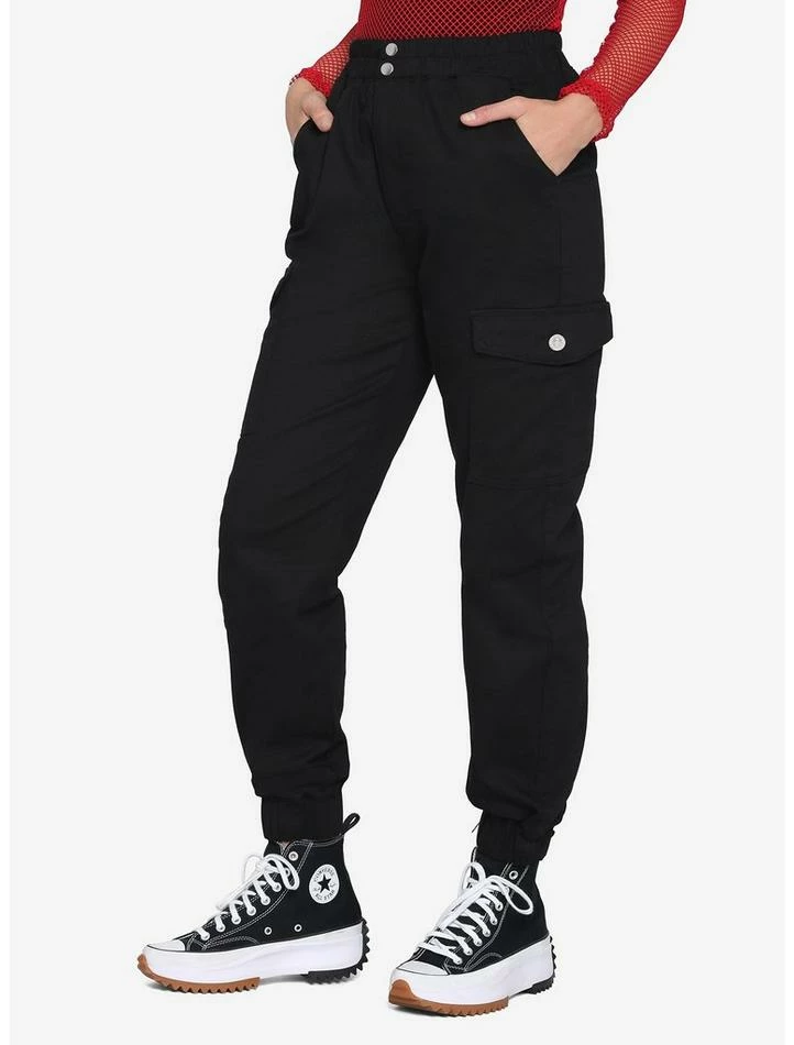 Keep your look stylish and casual in these black jogger pants featuring thigh pockets, double button and zip closure and elastic waistband and ankles.