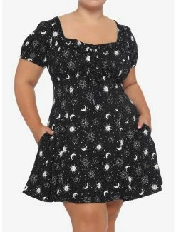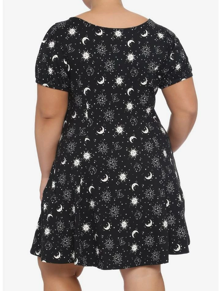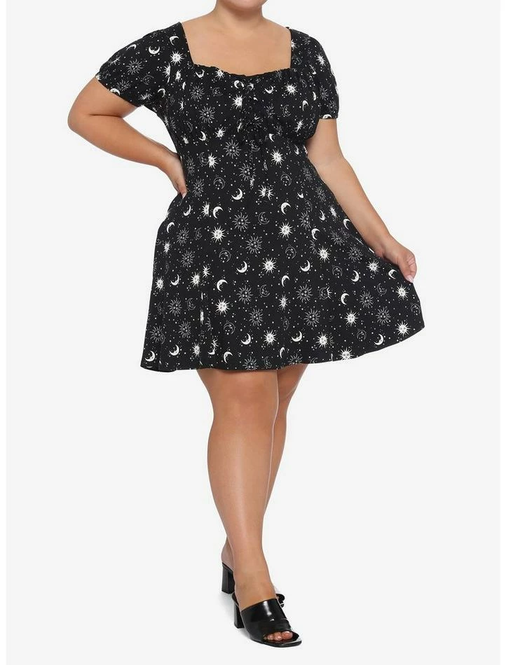 Keep it classic with an Empire waistline. This black soft dress features a white celestial print with moons and suns. There is lace-up detail at the chest, puffed sleeves and side seam hip pockets.