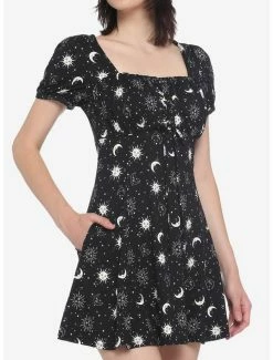 Keep it classic with an Empire waistline. This black soft dress features a white celestial print with moons and suns. There is lace-up detail at the chest, puffed sleeves and side seam hip pockets.