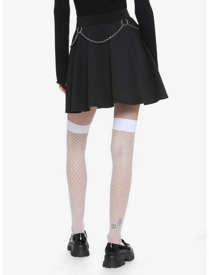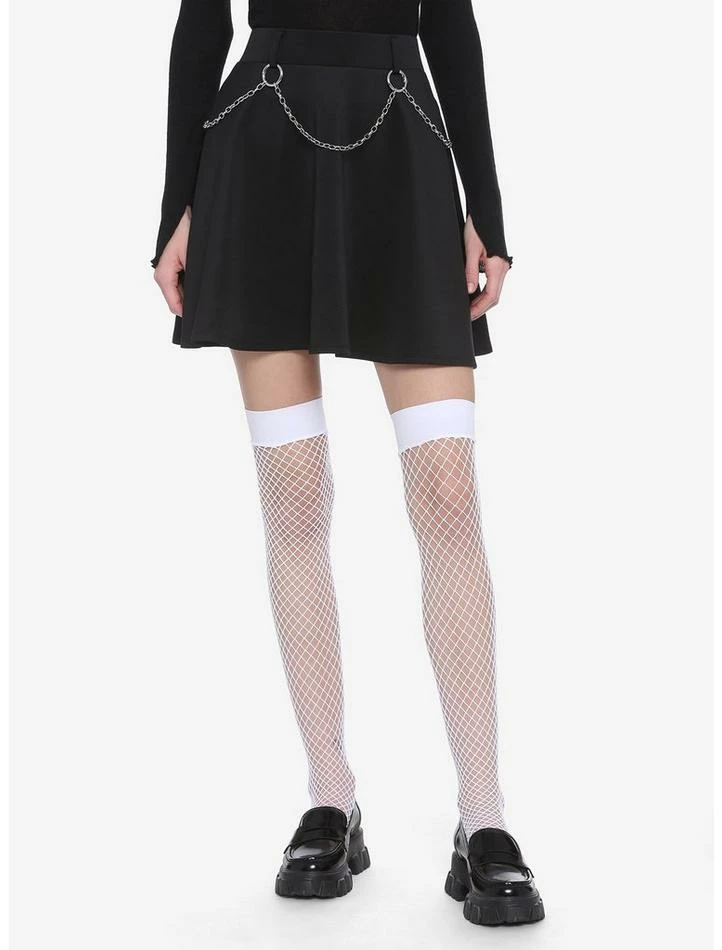 Take your plain black skater skirt up to 11 with the chains on this one! The short chains are attached at the belt loops with circular clips for easy customizing. Featuring hip pockets and an elasticated waistband.