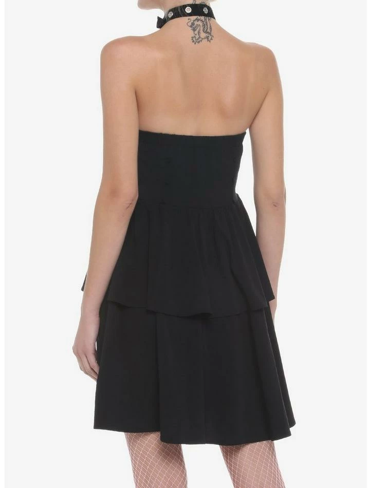 It’s all about the details. Elevate your little black dress look with some hardware! This dress features a tiered skirt and a sweetheart neckline. Comes with choker halter straps with grommet and buckle detailing, a half elasticated back and back zipper closure.