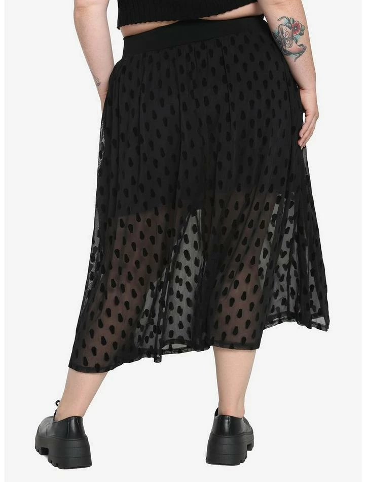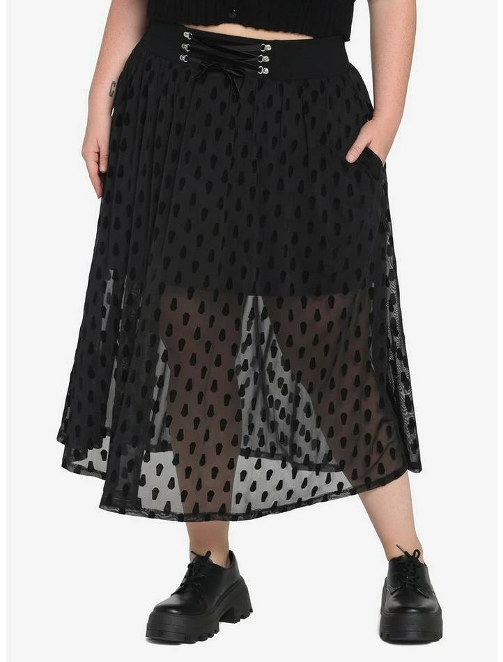 Goth, but make it summer. This mesh maxi skirt features a flocked coffin allover print, and a mini skirt lining so you can show some leg without getting too much sun.The waistband is elastic and has velvet lace-up detail.