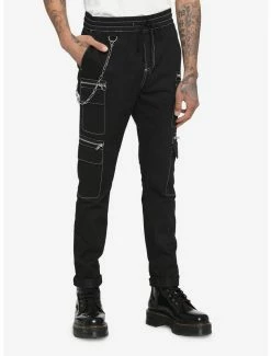 No need to sacrifice comfort for style with these black joggers! Featuring white contrast stitching throughout and several zipper thigh pockets, in addition to hip and back pockets. Comes with a removable chain and an elasticated drawstring waistband.