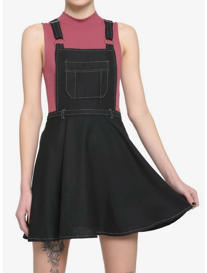 Lookin’ for a new skirtall to add to your wardrobe? We’ve got you covered! This black, woven skirtall features white contrast stitching throughout. It comes with chest and side seam pockets, belt hoops and adjustable straps with silver-tone O-ring detailing. Back zipper closure.
