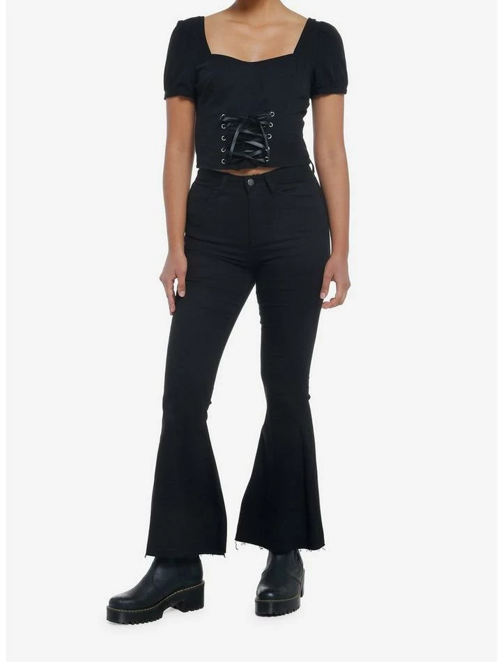 Tie your look together with this classy black crop top! We’re adding some glam vibes to your outfit with this puffy-sleeved top, featuring a corset-inspired lace-up detail at the center, back smocking details and bust cup seams.