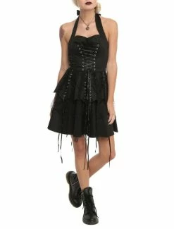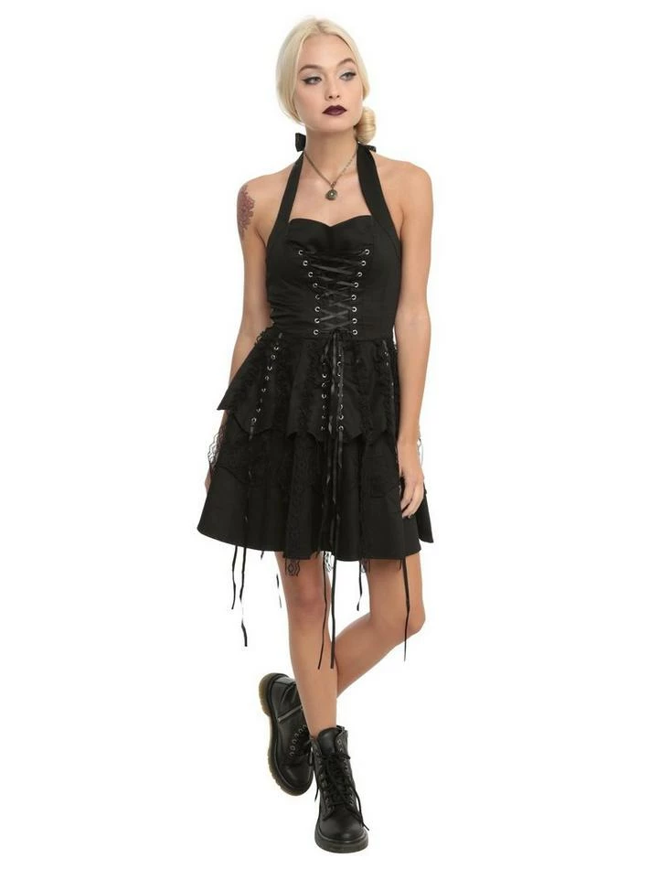This dress is our favorite dream within a dream! Underskirts, uneven hems, corseted front…there are so many details it’s hard to tell where one ends and the next begins, but we can all agree this black halter dress is dreamy! Hidden side zip, elastic back.