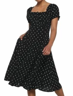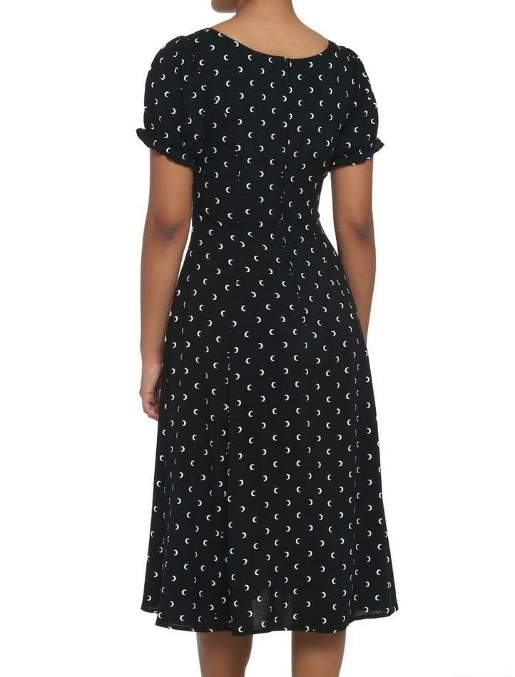 The perfect dress for nighttime? One with crescent moons on it! This midi dress has puff sleeves and a babydoll cut. There are also pockets.