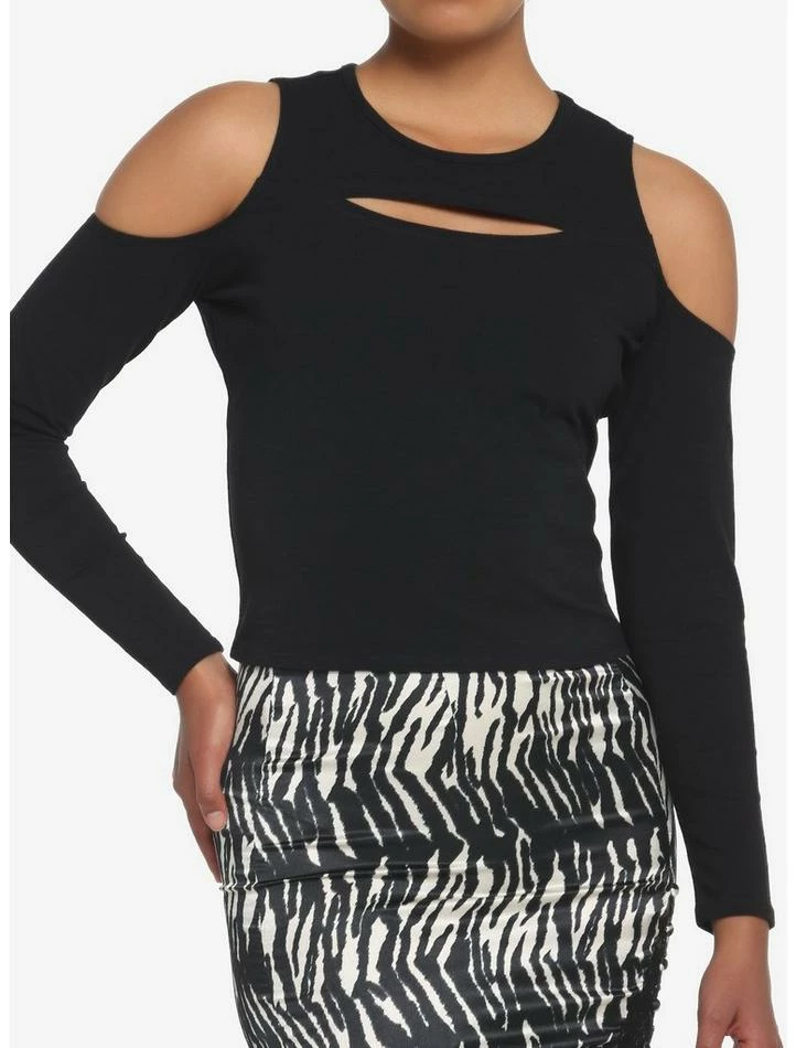 This black long-sleeve top is anything but basic. It features a cutout accent on the front and cold shoulder detailing.