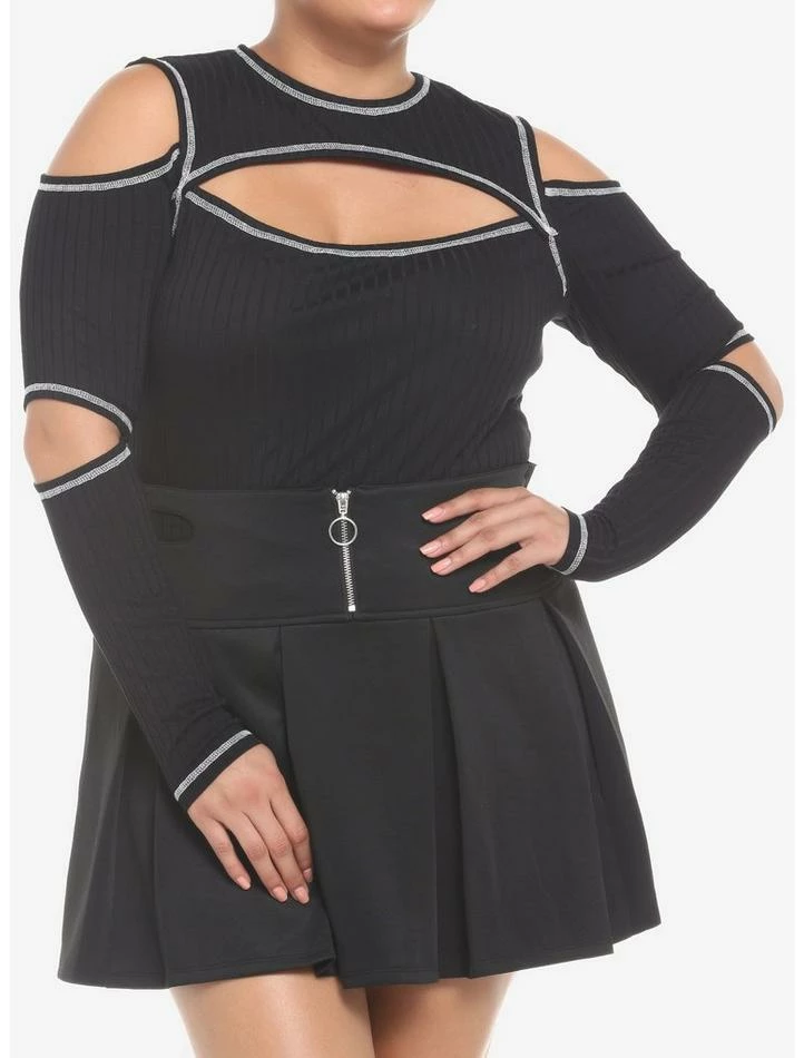 Elevate your basic black tee with some subtle details! This ribbed top has a cropped length and features contrast stitching throughout. Comes with cold shoulders and cutout detailing at the chest and arms for an extra touch of edge.