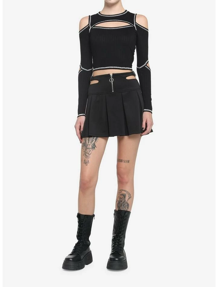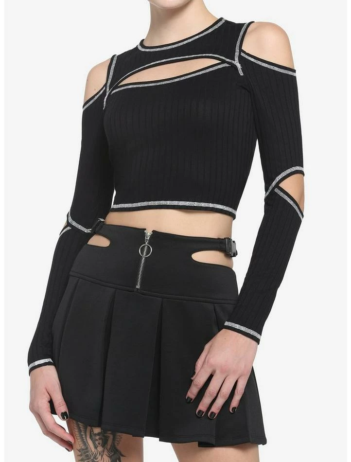 Elevate your basic black tee with some subtle details! This ribbed top has a cropped length and features contrast stitching throughout. Comes with cold shoulders and cutout detailing at the chest and arms for an extra touch of edge.