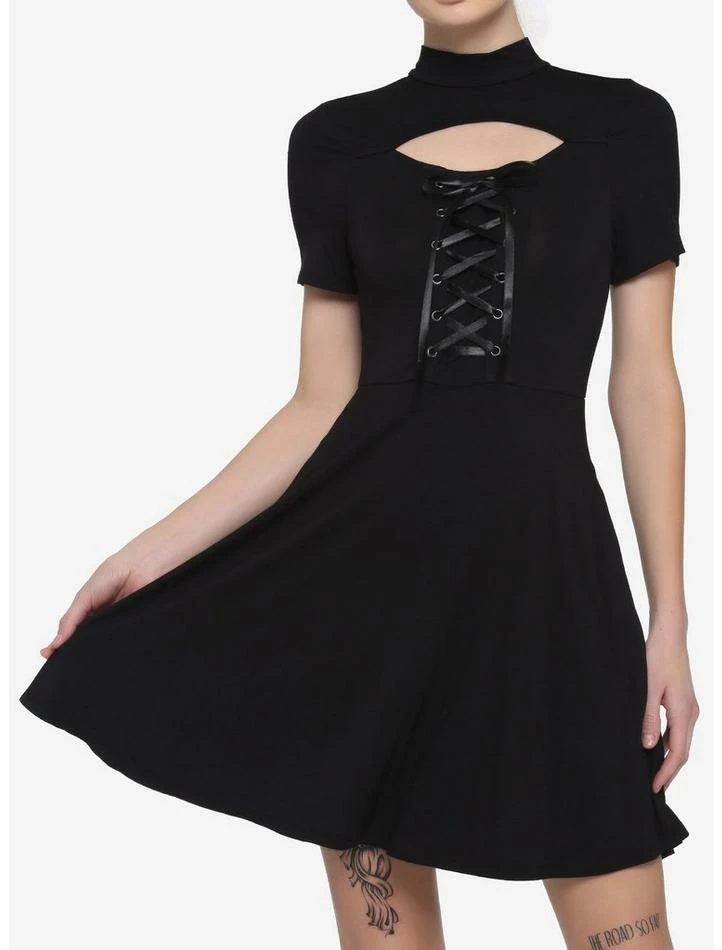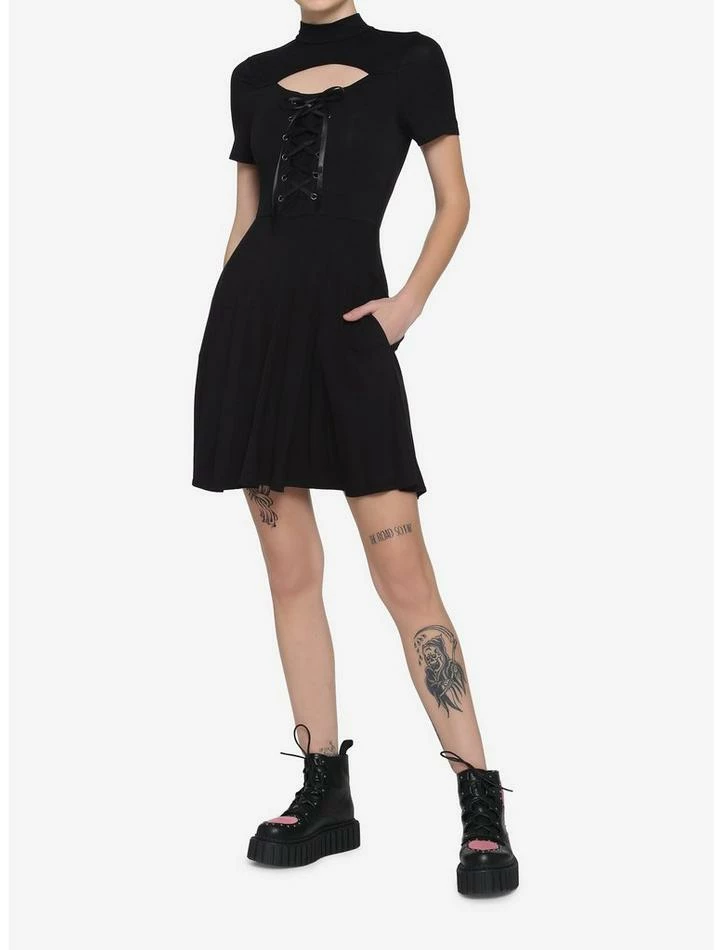 This black dress is the perfect outfit for your next coven meeting! Featuring cutout and lace-up detailing on the chest, mock neck and pockets! Back of neck button closure.
