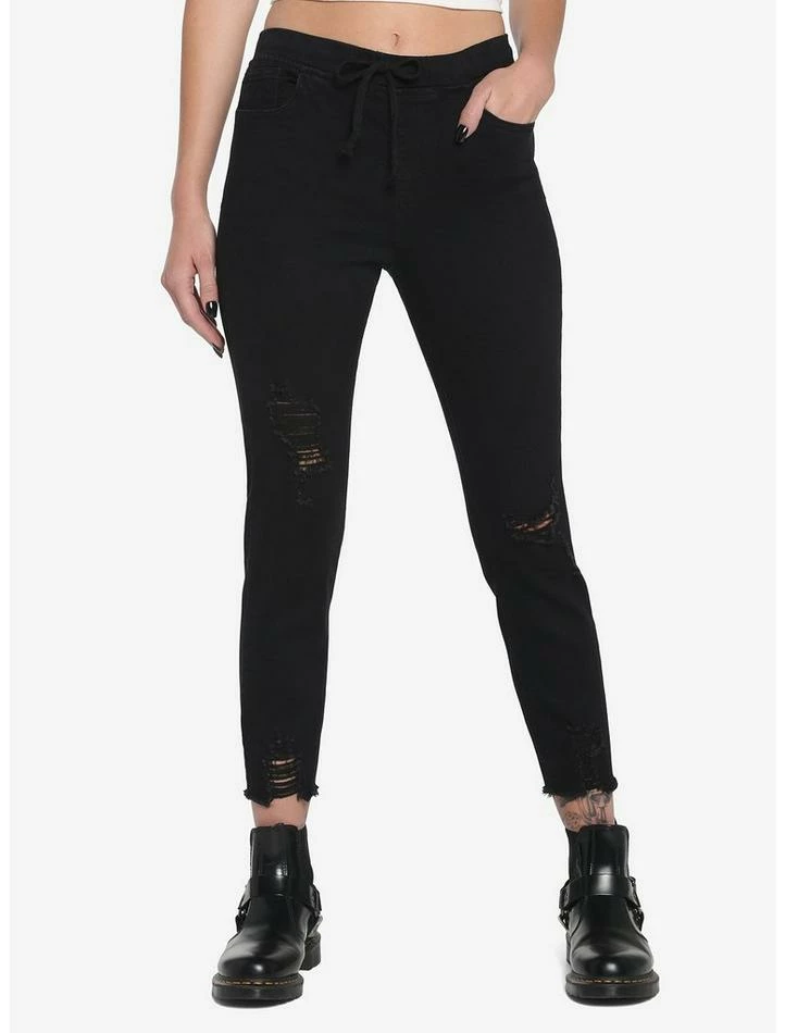 Destructed skinny jeans with an elastic waist? We’re so here for it. This pair features destruction at the knees and bottom hems, and a drawstring elastic waist like the kind you’d find on your favorite sweatpants.Front and back pockets, too!