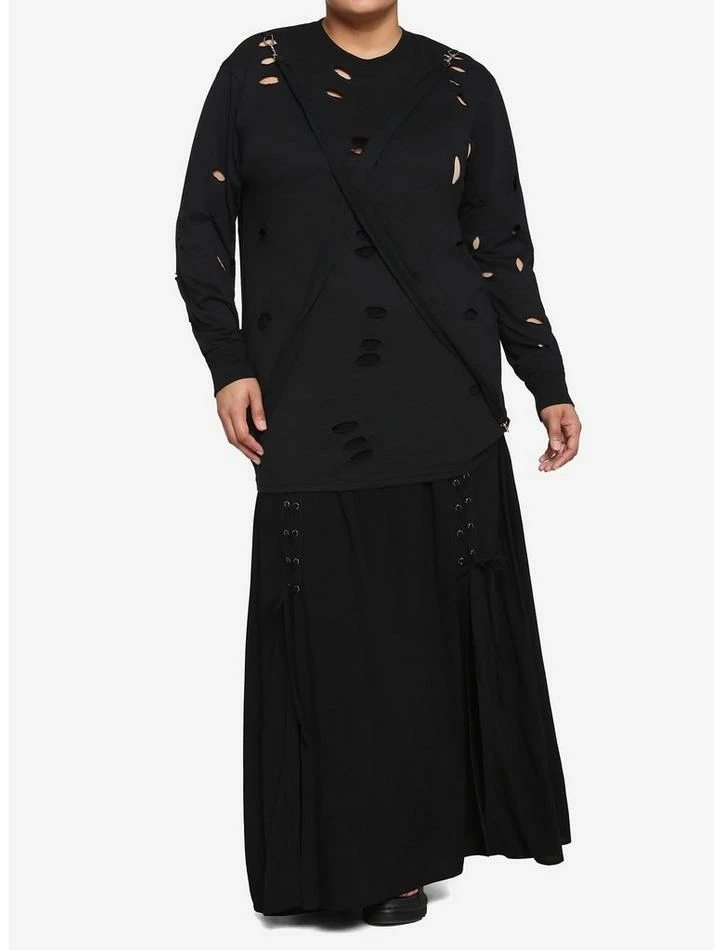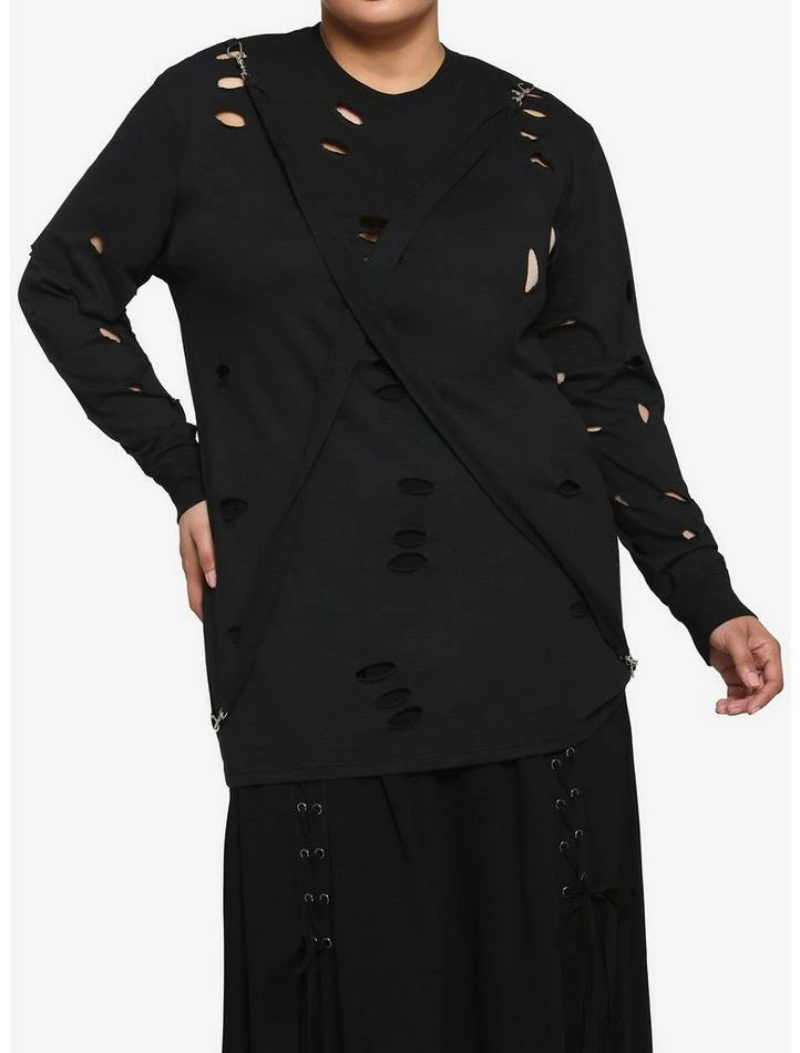 This black long-sleeve tee is anything but basic. It features torn accents on the front, removable front strap with silver-tone hardware and an oversized fit.ย