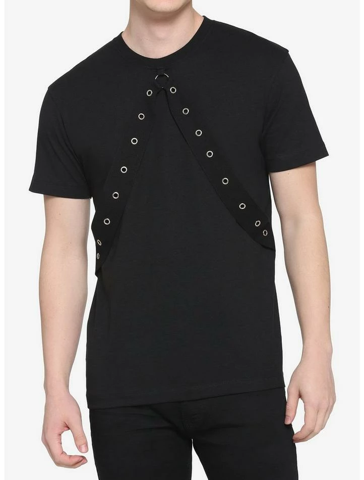 This black tee is anything but basic! It features two straps on the front connected to an O-ring with a row of silver-tone grommets.