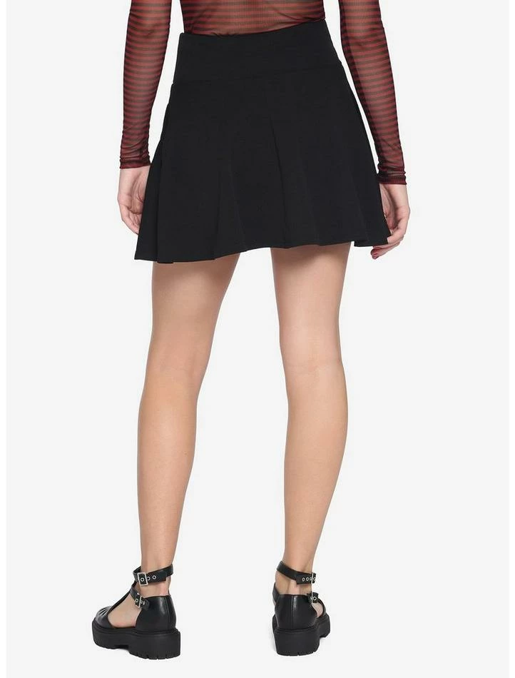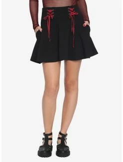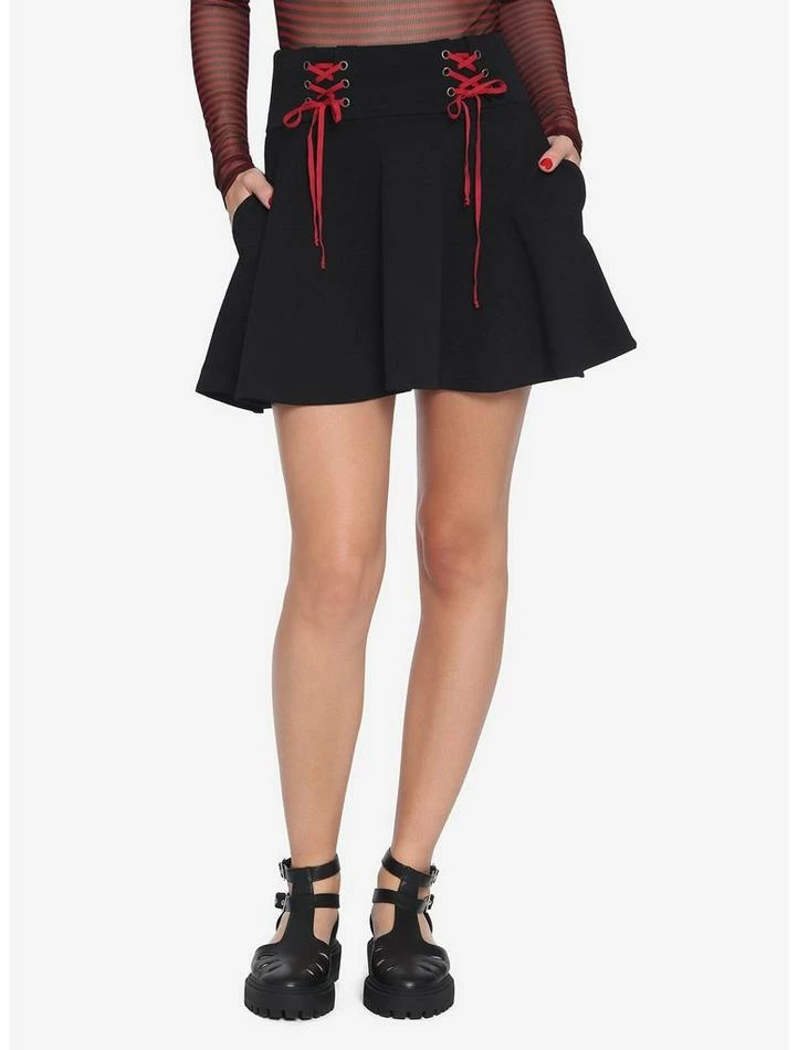 Lace up and get going! This black skater skirt features a red double lace-up front as well as pockets.