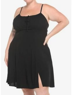 ย Go for a timeless look, but keep it fun for summer! This black empire waist dress features tie-front detailing and a flirty slit. Comes with adjustable spaghetti straps, ruching on the back and side seam pockets.