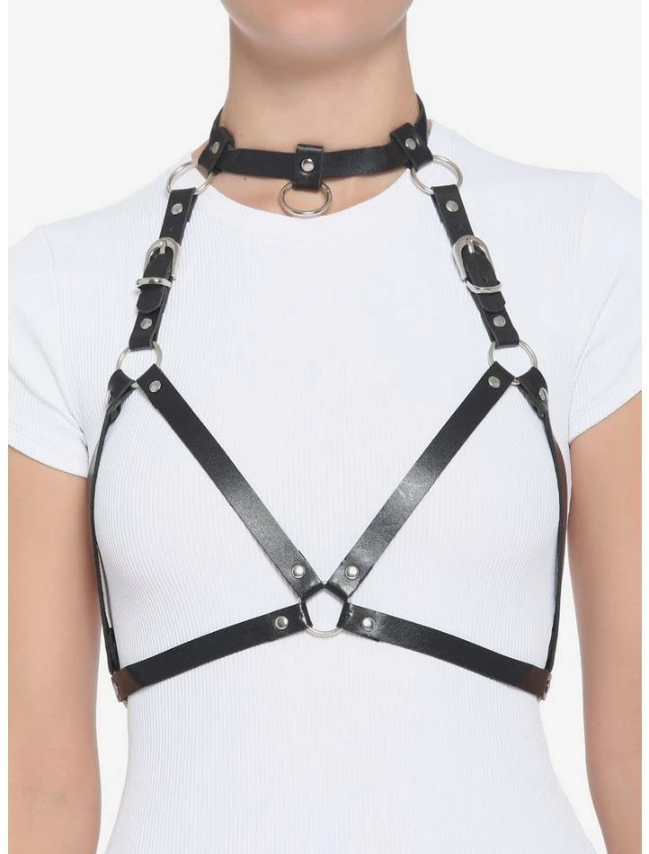 Make a statement with this faux leather harness featuring a triangle design with O-rings and adjustable buckles.Β