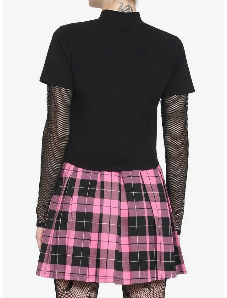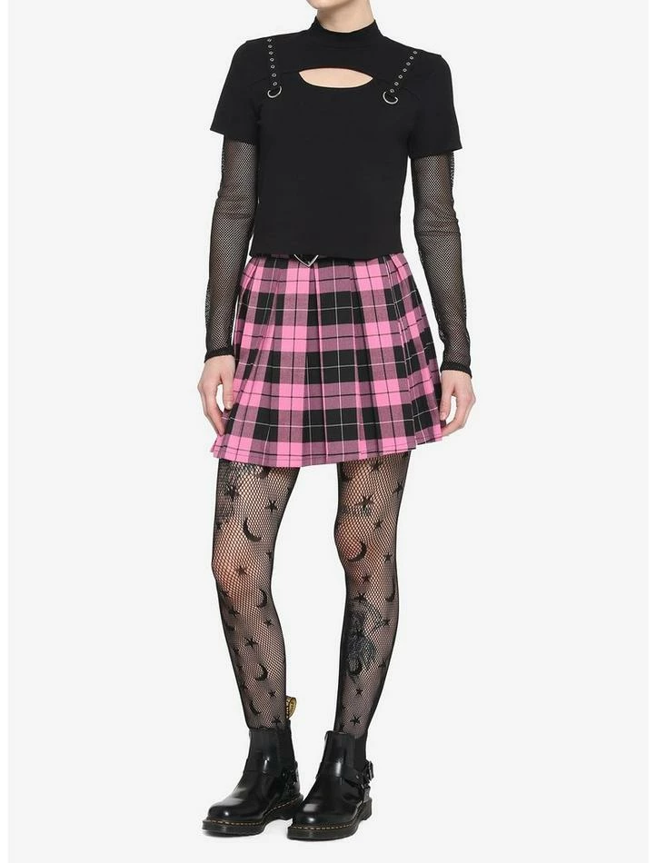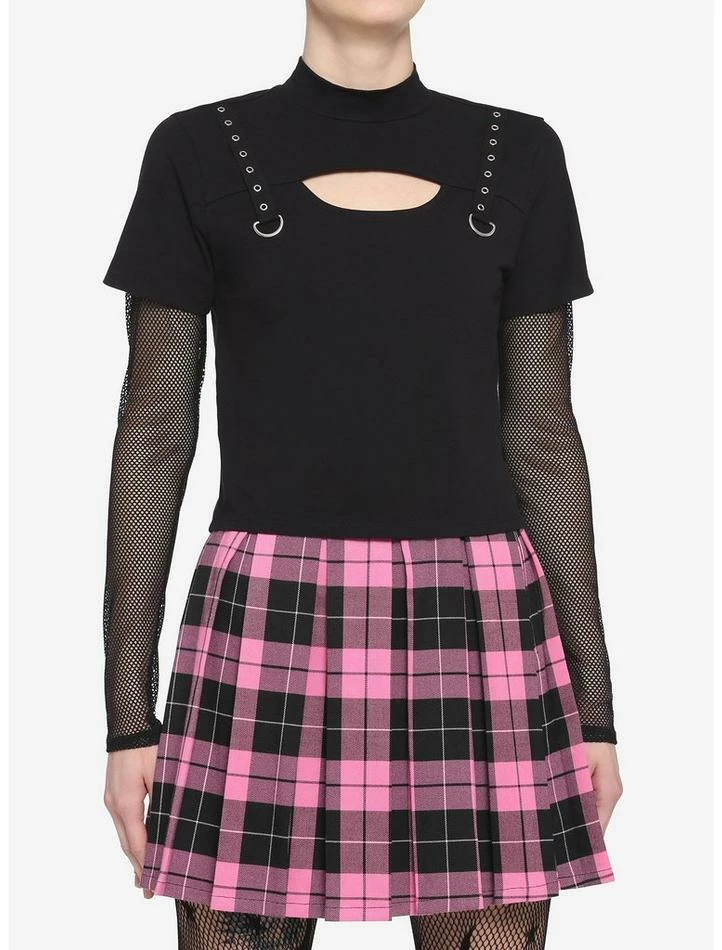 This twofer gives major throwback vibes. Grommets, D-rings, fishnet sleeves, a keyhole neckline, a mock neck… they’re all here. Throw it on and your look is complete.