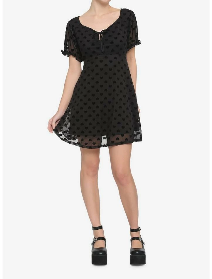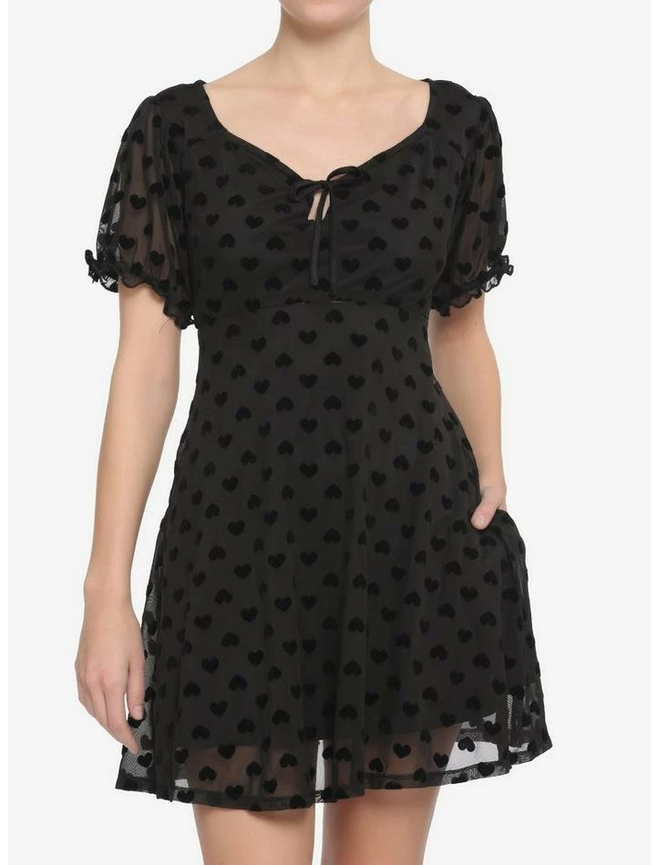 Wear your heart all over! This black babydoll dress features a sheer overlay with a flocked heart print, puffed sleeves, keyhole detailing with tie, empire waist and side seam pockets.