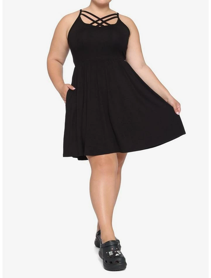Keep it classy and simple with this summer-friendly black dress. Features front strappy detailing and pockets.