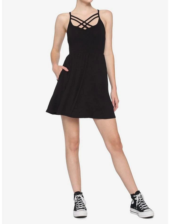 Keep it classy and simple with this summer-friendly black dress. Features front strappy detailing and pockets.
