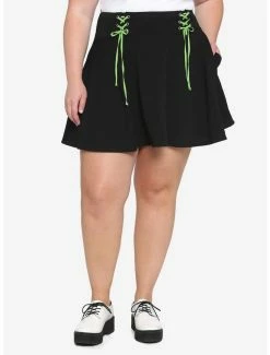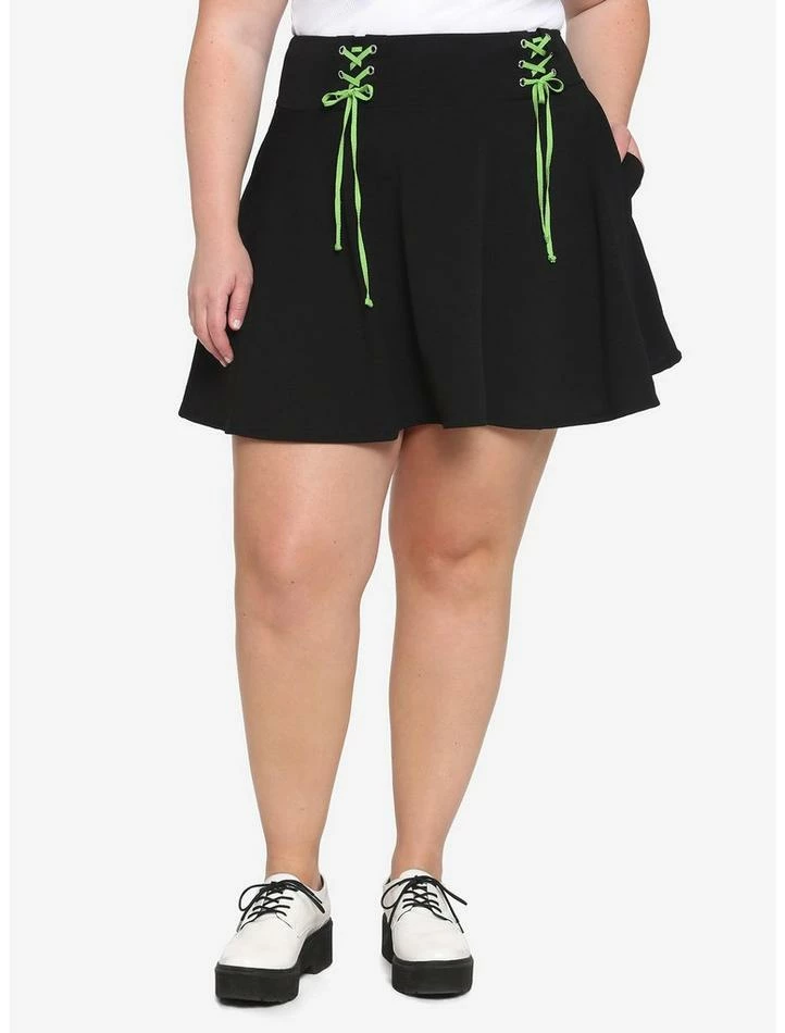 Add a pop of color to your look with this black skater skirt featuring green double lace-up detailing on the waistband and pockets.