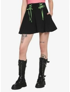 Add a pop of color to your look with this black skater skirt featuring green double lace-up detailing on the waistband and pockets.