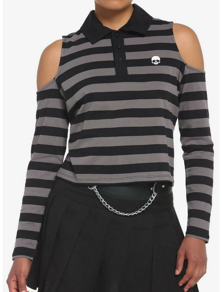 Calling all sk8ter gurls! Live out your pop punk dreams in this black and grey, striped shirt! It comes with cold shoulder detailing for a bit of sass, and features a classic polo collar and a skull embroidered at the chest.