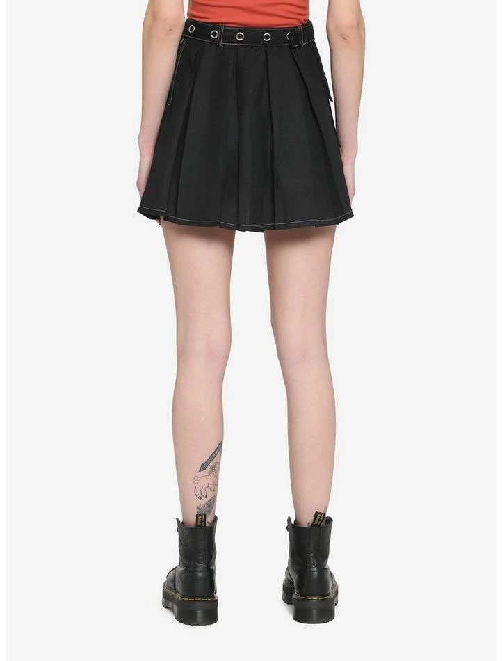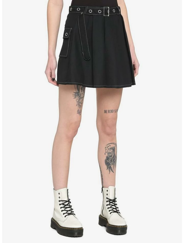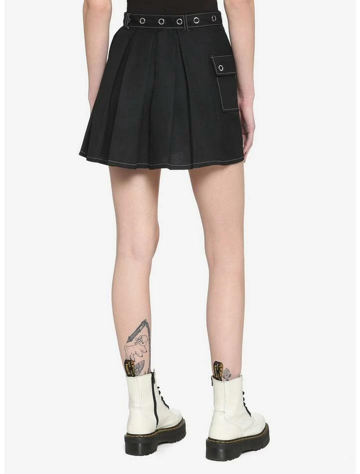 Keep your look classic with this black pleated skirt. Comes with a silver-tone grommet belt, white contrast stitching, side cargo pocket and side seam closure. Pair with fishnet tights and combat boots to complete your look!