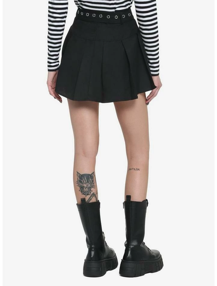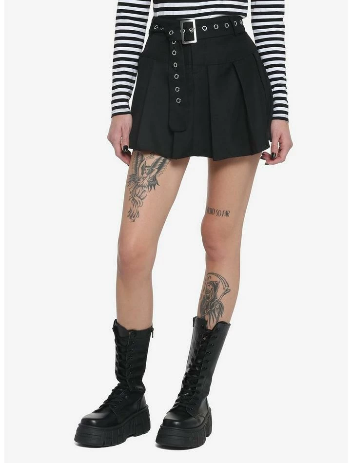 Keep it edgy and flirty in this black, pleated mini skirt! Comes with a removable grommet belt and a front double-button and zipper closure.Β