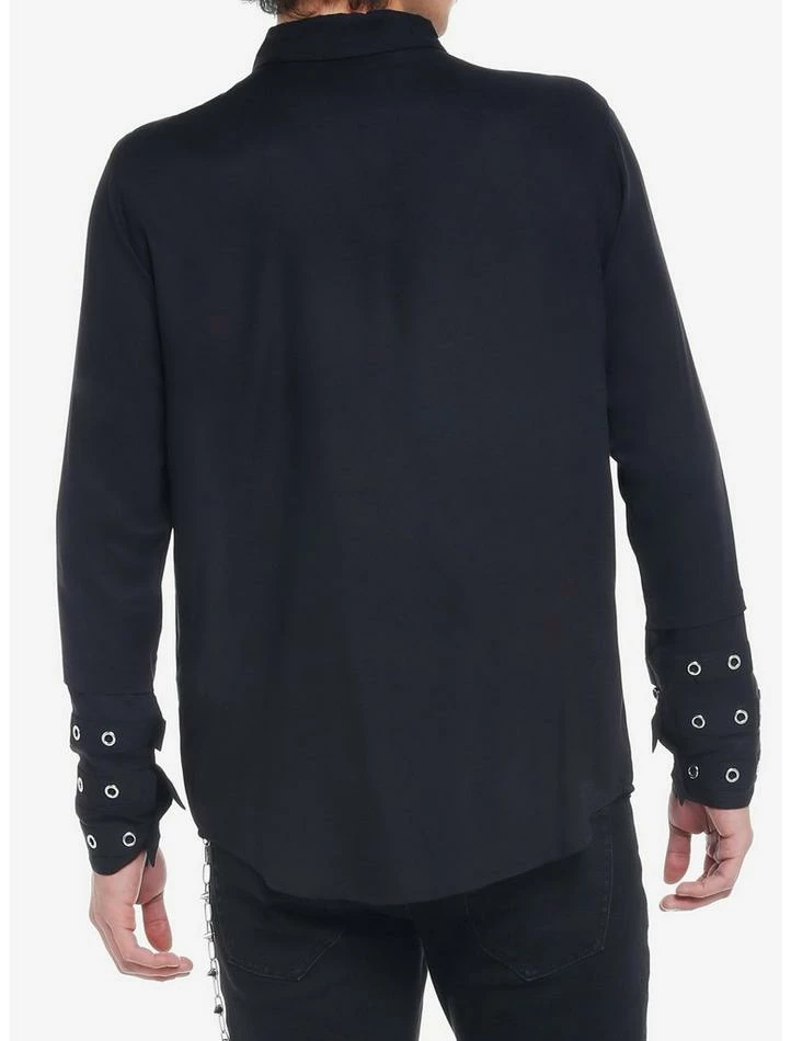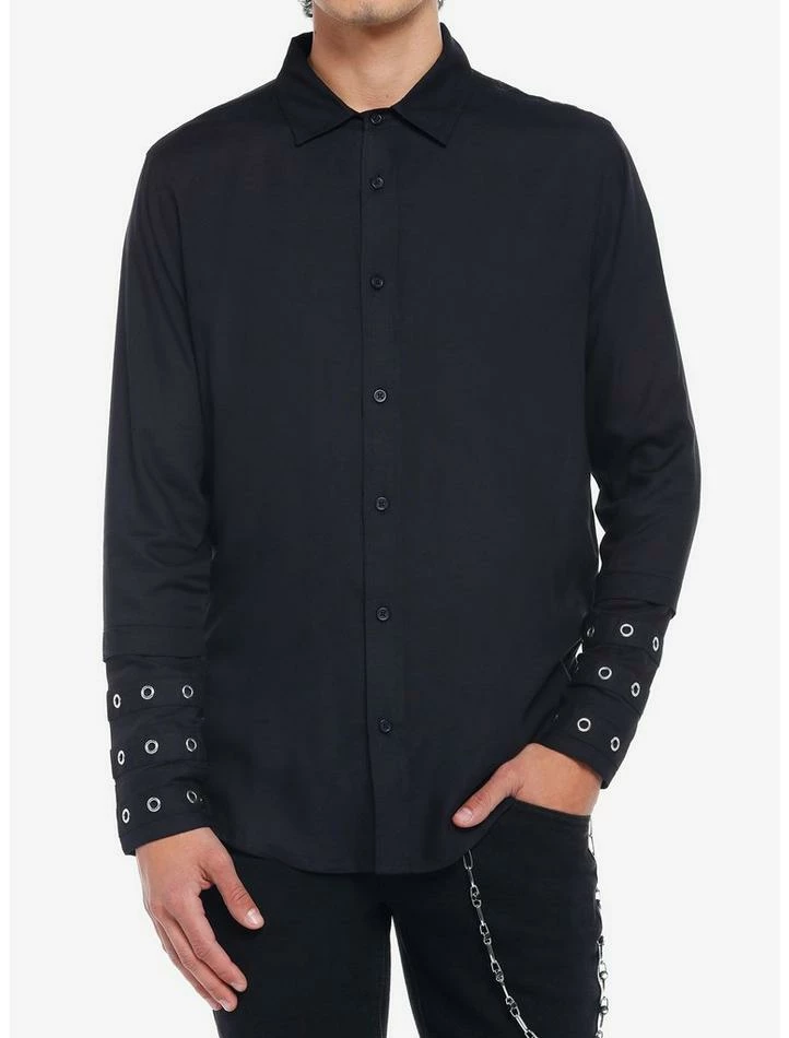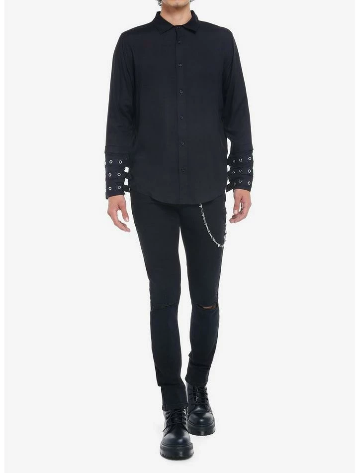 Searching for a black button-up with an edge? This style has sleeves decorated with straps of grommets.