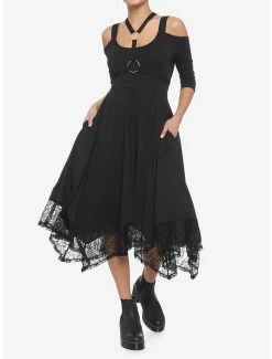 Harness the power of a new look with this black maxi dress. The elastic and O-ring harness sits comfortably around the waist and neck, with lace at the hem, hip pockets and cold shoulder cutouts.