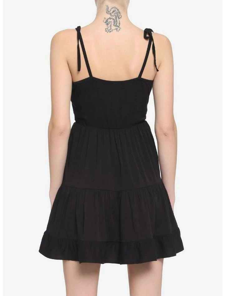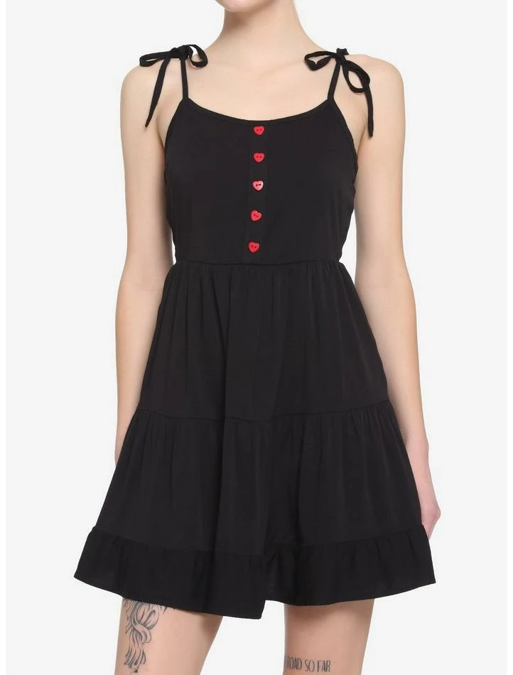 Follow your heart… it’s leading you to this adorable dress! This black dress has a tiered skirt and an elastic waistband. It features adjustable tie-straps, pockets and red heart-shaped button detailing down the chest. Pair with some combat boots or Mary Janes to complete your look!
