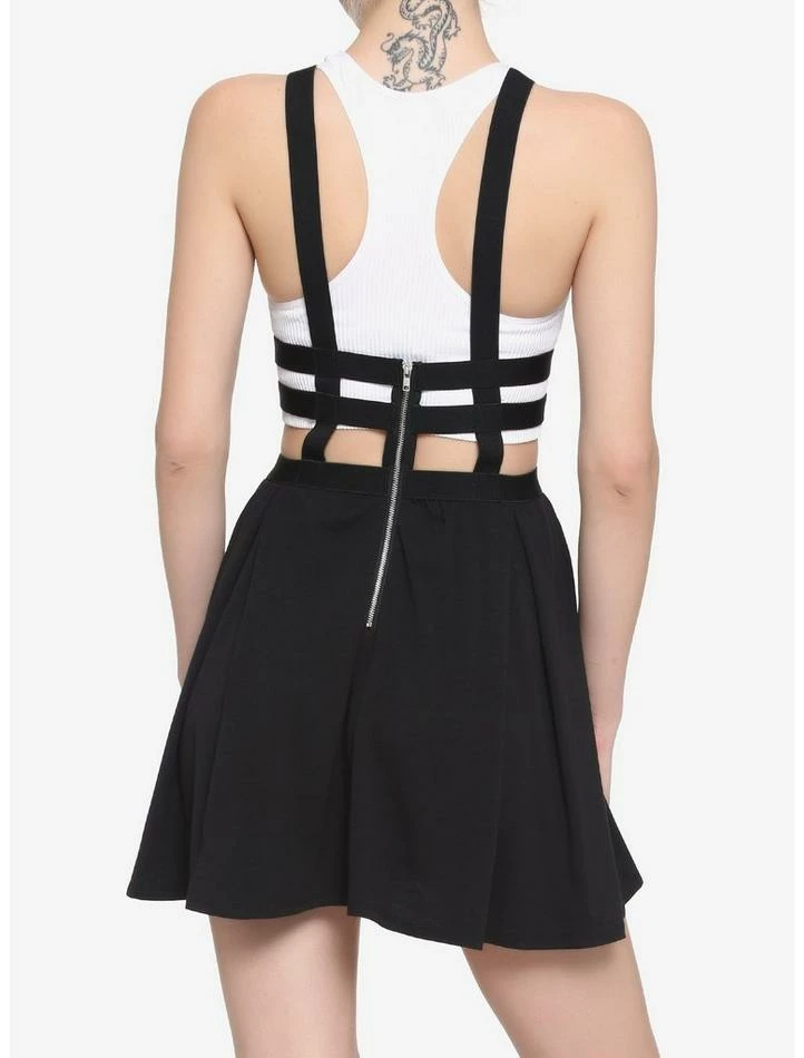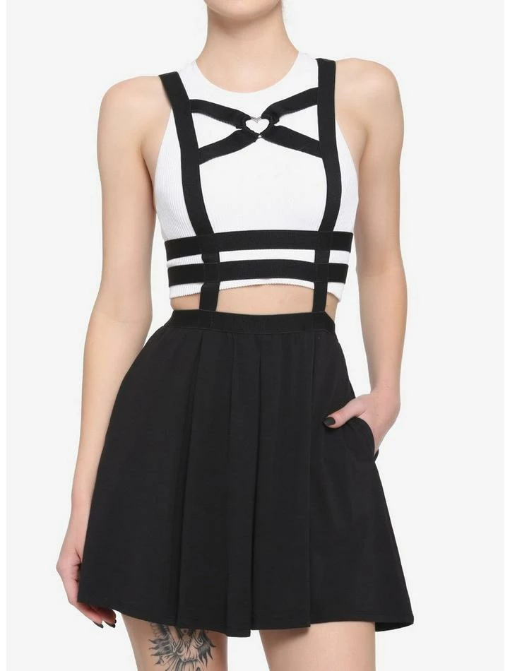 Get ready to fall in love with this black skirt! It features black caged elastic detailing, silver-tone heart-shaped hardware, back zipper closure and pockets.