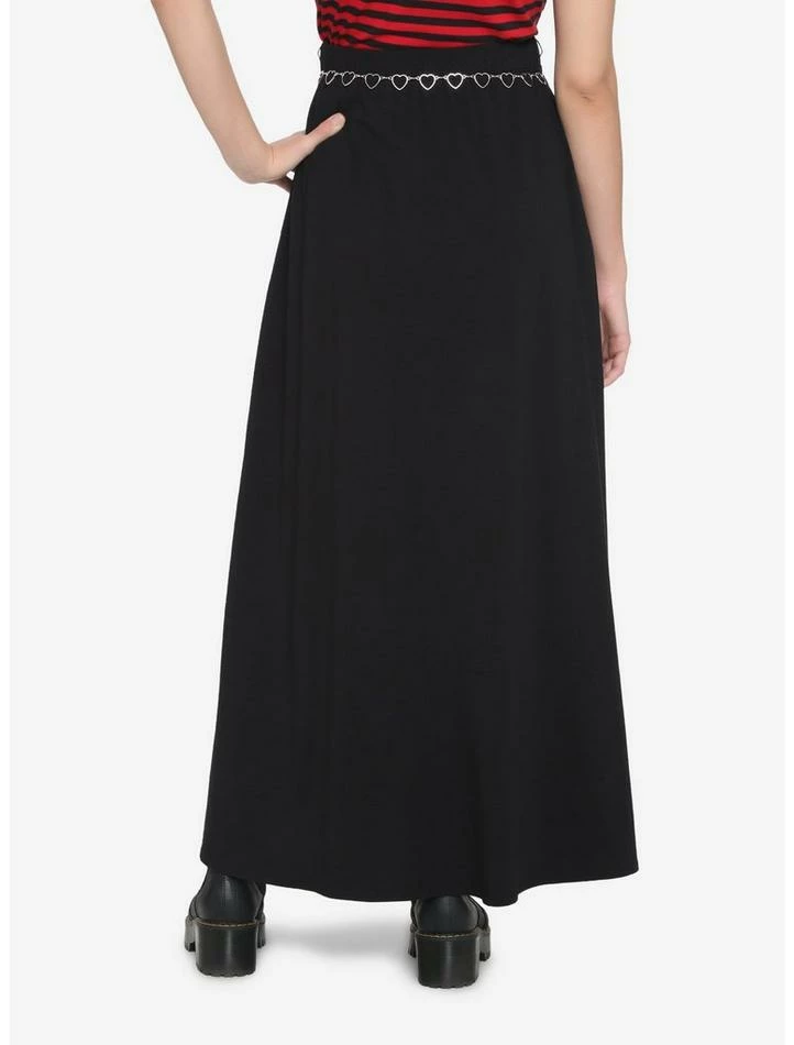 Wanna keep your Valentine’s day look dark and mysterious? We’ve got you covered! This black maxi skirt comes with a removable silver-tone heart chain belt, two slits, elastic waistband and side seam pockets.ย